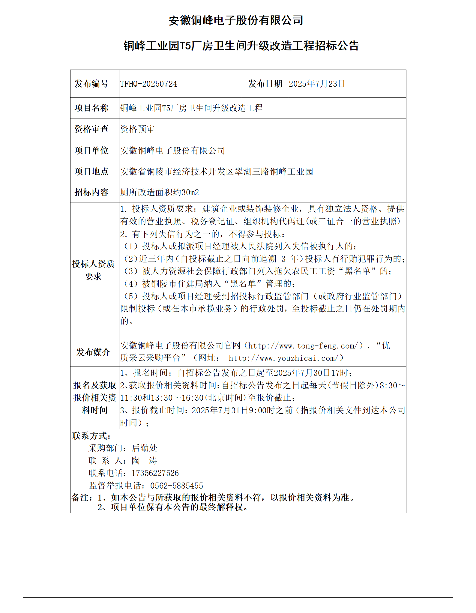 安徽銅峰電子股份有限公司 (銅峰工業(yè)園T5廠房衛(wèi)生間升級改造工程招標(biāo)公告)_01
