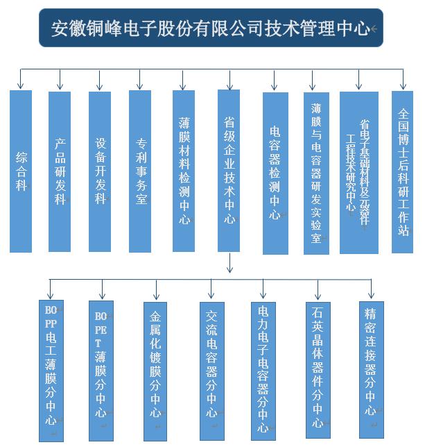 銅峰公司為國家高新技術企業(yè)、國家火炬計劃重點高新技術企業(yè)、國家火炬計劃銅陵電子材料產(chǎn)業(yè)基地重點骨干企業(yè)。公司建有完整的科研創(chuàng)新組織體系,設立技術管理中心作為技術研發(fā)的總管理機構(gòu),組織協(xié)調(diào)公司的各分子公司和相關部門,以確保公司技術創(chuàng)新精確高效地運行。技術管理中心下設綜合科、產(chǎn)品研發(fā)科、設備開發(fā)科、專利事務室、薄膜材料檢測中心、電容器檢測中心以及薄膜與電容器研發(fā)實驗室,同時下設省級企業(yè)技術中心、安徽省電子基礎材料及元器件工程技術研究中心以及國家級博士后科研工作站。
